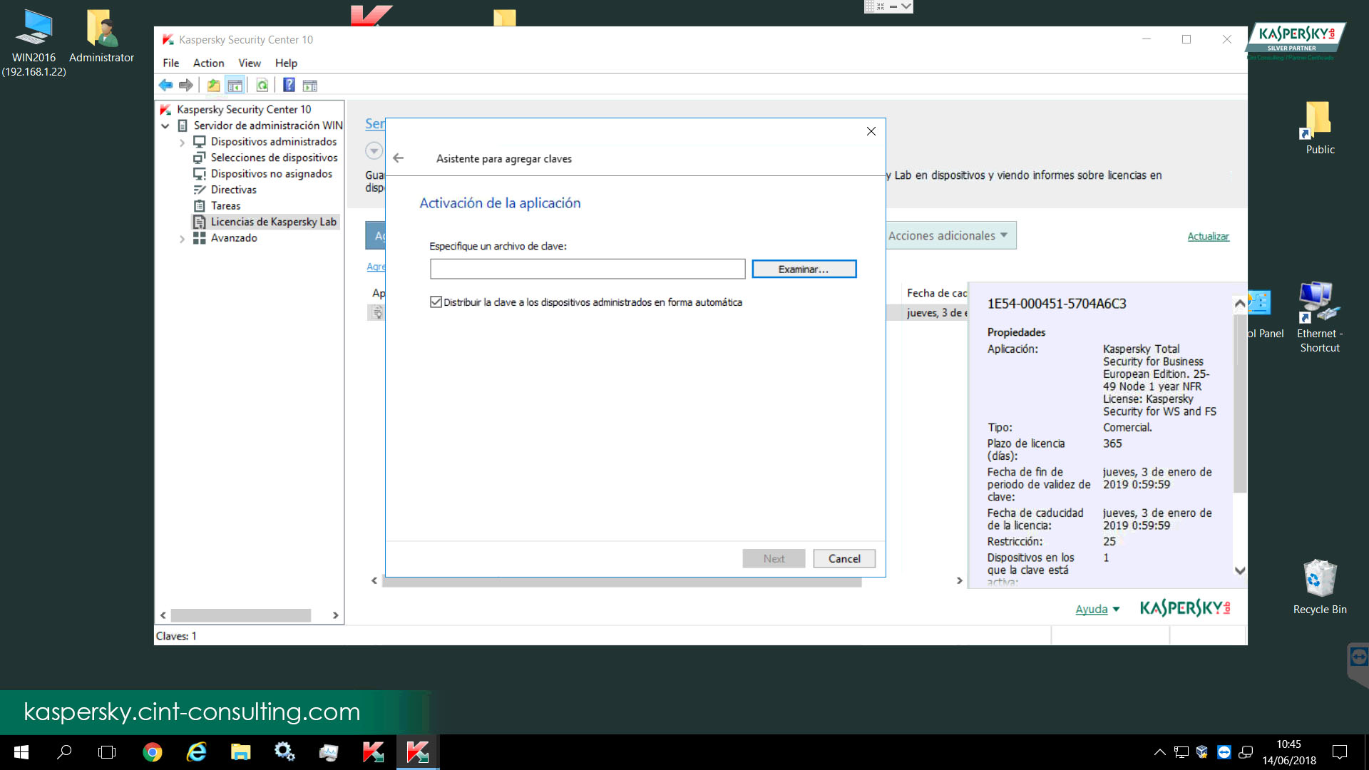 Debemos añadir ambos ficheros a la consola de administración desde el apartado del menú: Licencias de Kaspersky Lab > Agregar clave o código de activación. > Activar la aplicación con un fichero llave